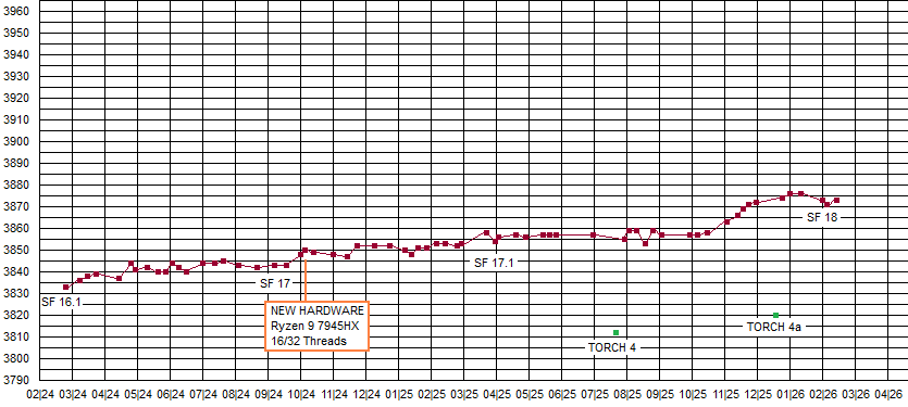 ------------------------------------------------------------------- Aborted testruns, because the tested engine was too weak to enter the UHO-Top15 Ratinglist: Heimdall 1.4.1, Renegade 1.2.0, Igel 3.6.0, Minic 3.41, Booot 7.3, Black Marlin 9.0, Equisetum 1.0, Clarity 8 Below you find a diagram of the progress of Stockfish in my tests since February 2026. And below that diagram, the older diagrams.